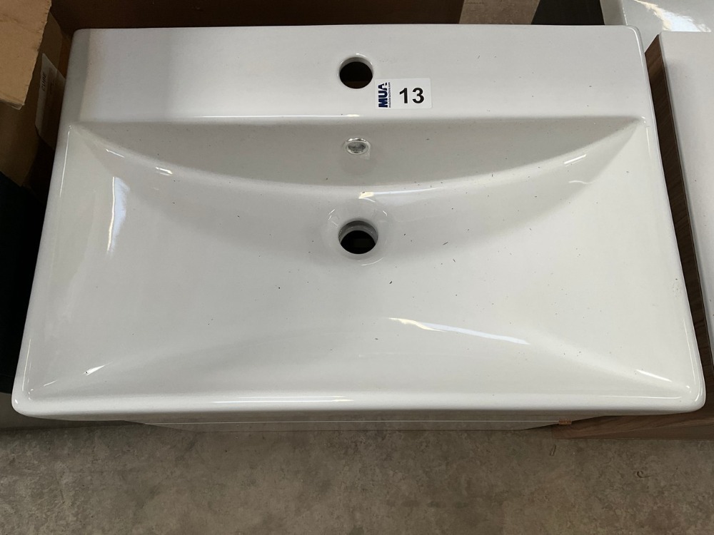 Lot 13APPROX. 600 TWO-DRAWER WALL-MOUNTED WHITE GLOSS VANITY UNIT AND BASIN