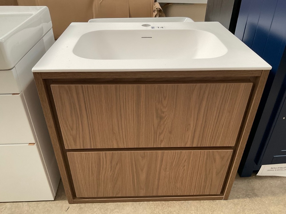 Lot 14APPROX. 600 WALL-MOUNTED TWO-DRAWER WALNUT UNIT AND BASIN