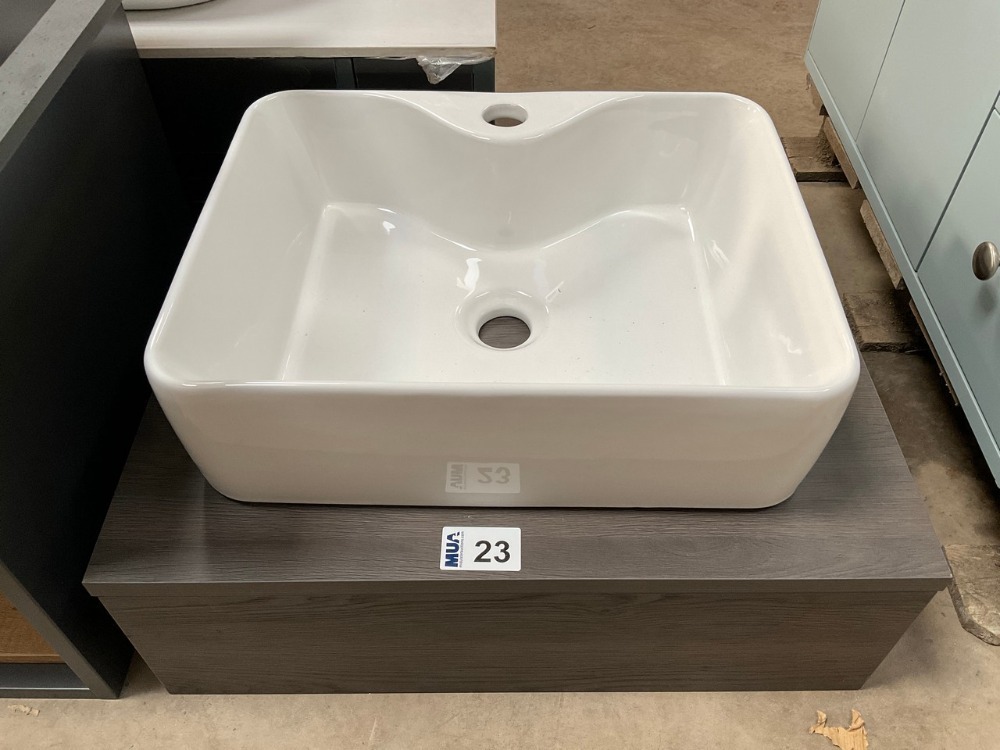 Lot 23APPROX. 600 SINGLE-DRAWER WALL-MOUNTED VANITY UNIT IN DARK WOOD WITH ONE-TAP-HOLE BASIN