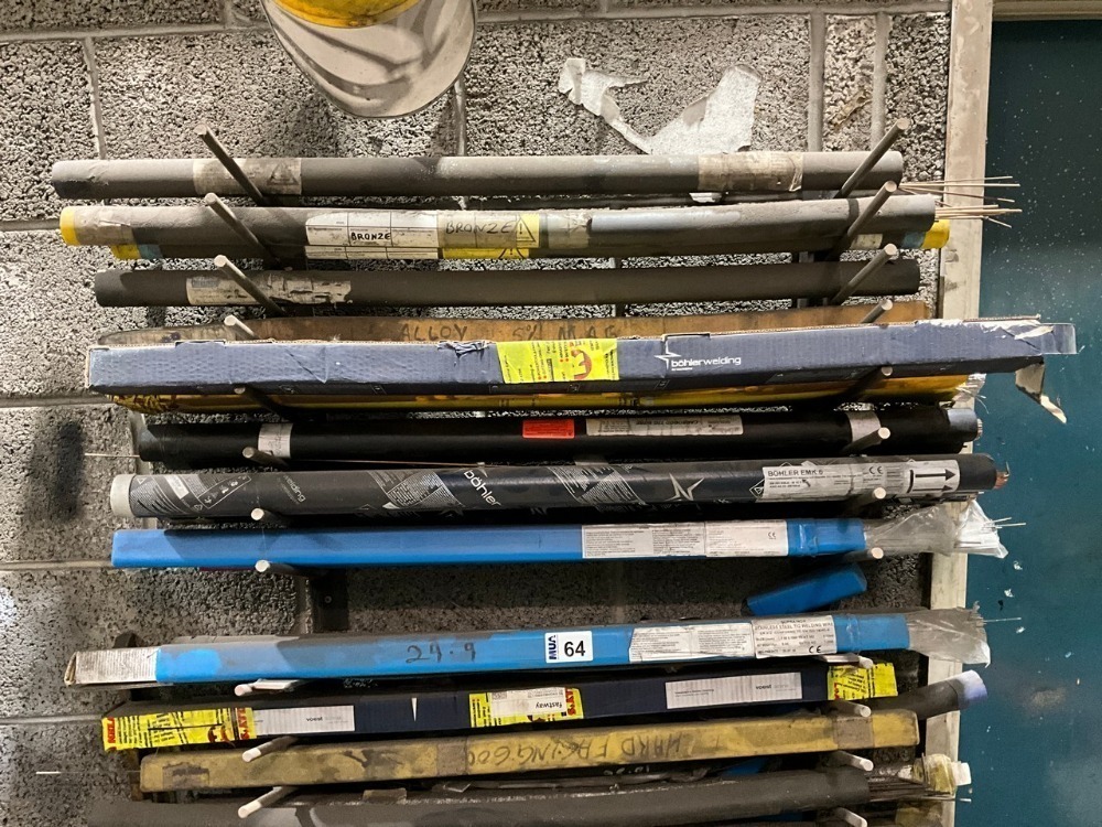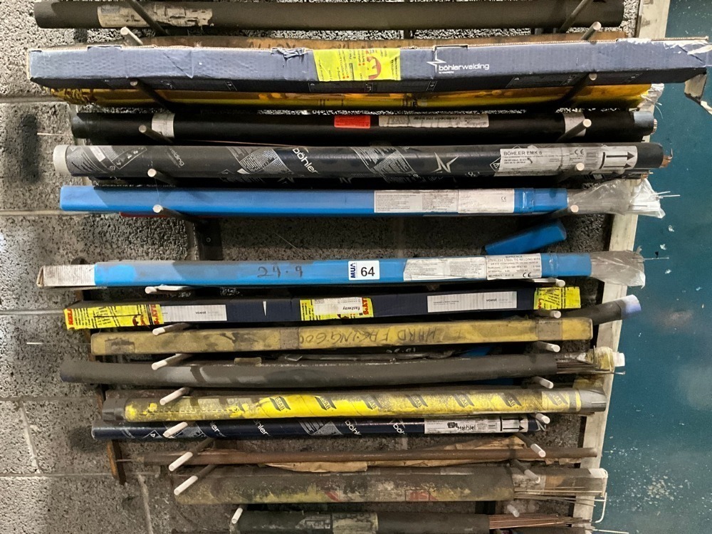 Lot 64METAL WALL RACK TO INC. ASSORTED WELDING RODS